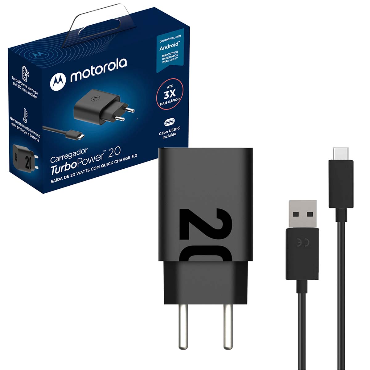 Carregador de parede Motorola Rápido Turbo Power 20W garante uma super carga de energia em apenas alguns minutos com a tecnologia Qualcomm Quick charge 3.0 que é 3x mais rápido, com entrada USB-C compatível com centenas de dispositivos presentes no mercado. Aprovado nos mais altos níveis de eficiência energética, o carregador fornece energia de forma segura e contínua para quando você mais precisa.