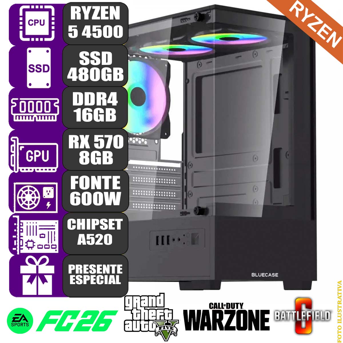 - Desempenho otimizado para jogos simples, RPG e FPS, com a potente placa de vídeo RX 570 8GB.