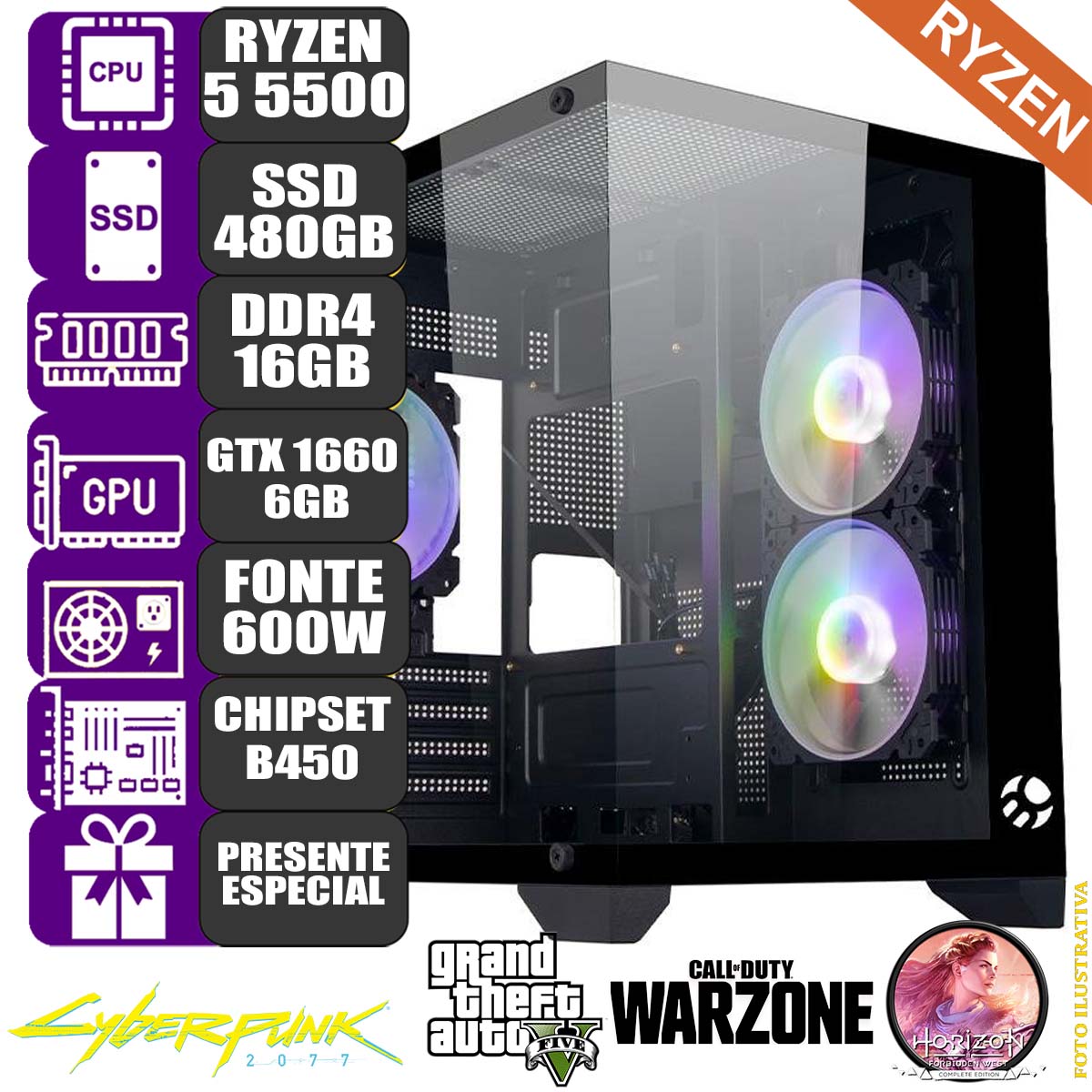 - **Processador:** AMD Ryzen 5 5500 (6 núcleos, 3,6 GHz com Turbo de até 4,1 GHz, Cache de 11MB, AM4)