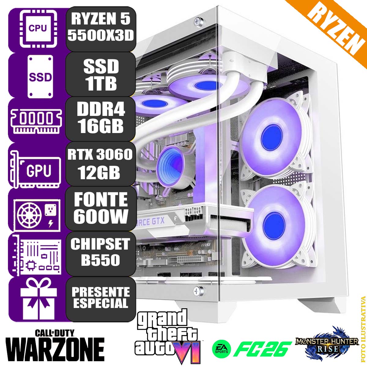 - Desempenho otimizado para jogos exigentes, com a potente configuração do Ryzen 5 5500X3D e a placa de vídeo RTX 3060.