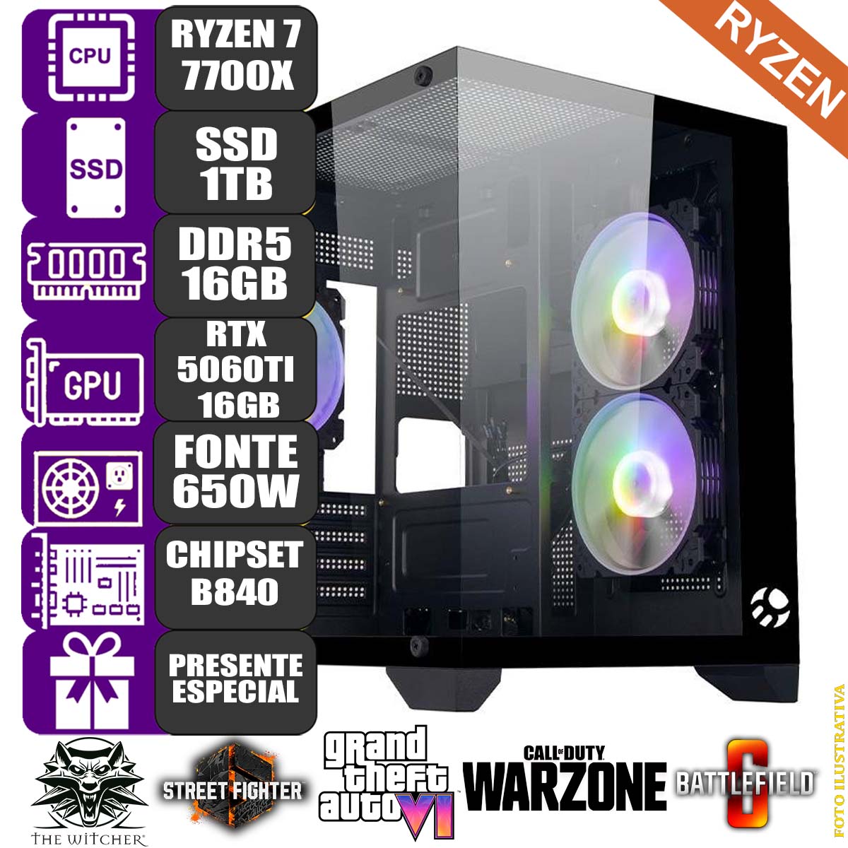 - Desempenho otimizado para jogos exigentes, com a potente configuração do Ryzen 7 7700X e a placa de vídeo RTX 5060 Ti.