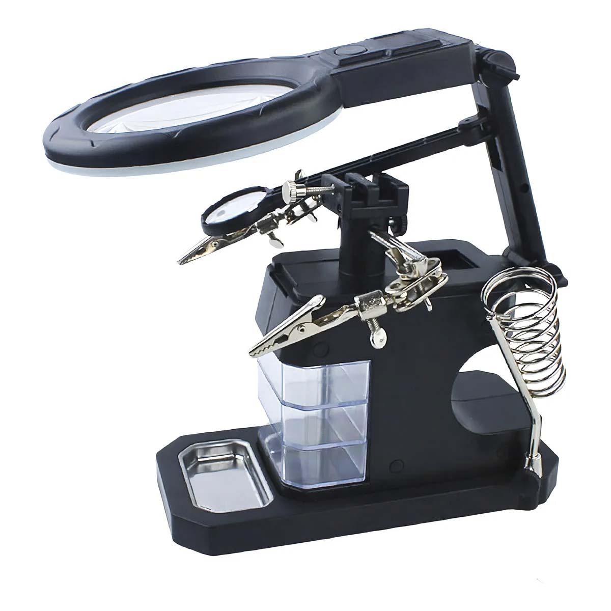Tenha mais precisão e praticidade em seus trabalhos manuais com a Lupa de Bancada XC-LP-803 da X-Cell. Ideal para eletrônica, soldagem, joalheria e artesanato, conta com lentes acrílicas de alta qualidade com aumentos de 2.5D, 4D e 16D. Equipada com 16 LEDs SMD de alto brilho, terceira mão com garras jacaré ajustáveis, suporte para objetos, mini morsa, três gavetas organizadoras e suporte para ferro de solda. Pode ser alimentada por 3 pilhas AAA ou via cabo USB, oferecendo versatilidade e conforto em um único equipamento multifuncional.
