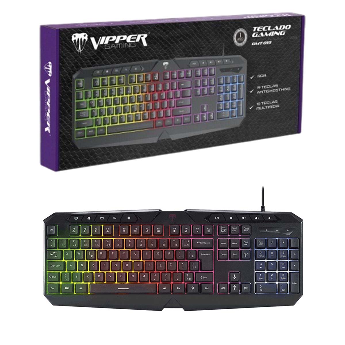 Características: Teclado Gamer preto, iluminação RGB, 104 teclas + 10 teclas multimídia, 19 teclas Anti-Ghosthing, compatível com Windows 200/XP/Vista/7/8/10/Linux e MAC, conexão USB e comprimento 1,5m.